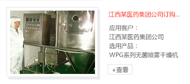 近年來(lái)我公司在食品、調(diào)味品、中藥、生物制品、化工和融溶造粒等行業(yè)中發(fā)展較快、根據(jù)生物的熱敏性、吸濕性、易結(jié)塊、易粘壁的特點(diǎn),進(jìn)行特殊設(shè)計(jì),取得了較高的知名度。公司常年備有各類(lèi)試驗(yàn)樣機(jī)供客戶(hù)來(lái)人帶料進(jìn)行工藝試驗(yàn)。