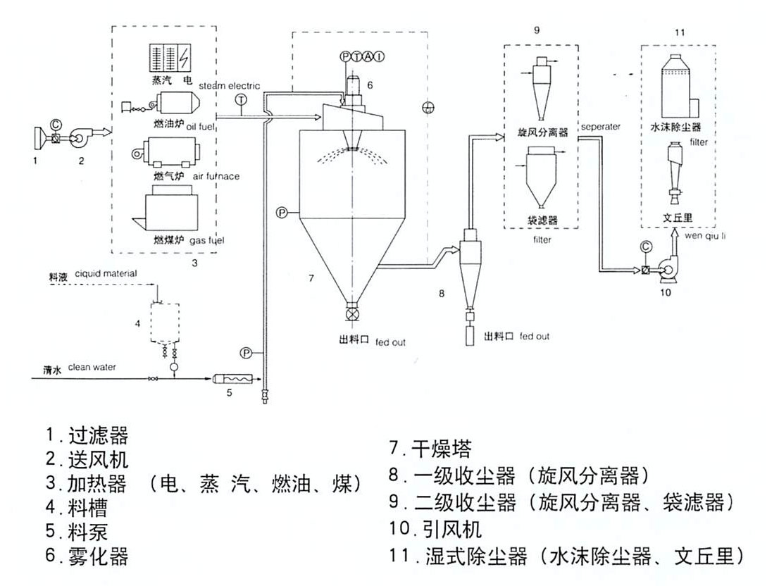 空氣通過過濾器和加熱器,進(jìn)入干燥塔頂部的空氣分配器,然后呈螺旋狀均勻進(jìn)入干燥室。料液由料液和熱空氣并流接觸,水份迅速蒸發(fā),在極短的時間內(nèi)干燥為成品。成品由干燥塔底部和旋風(fēng)分離器排出,廢氣由風(fēng)機(jī)排出。